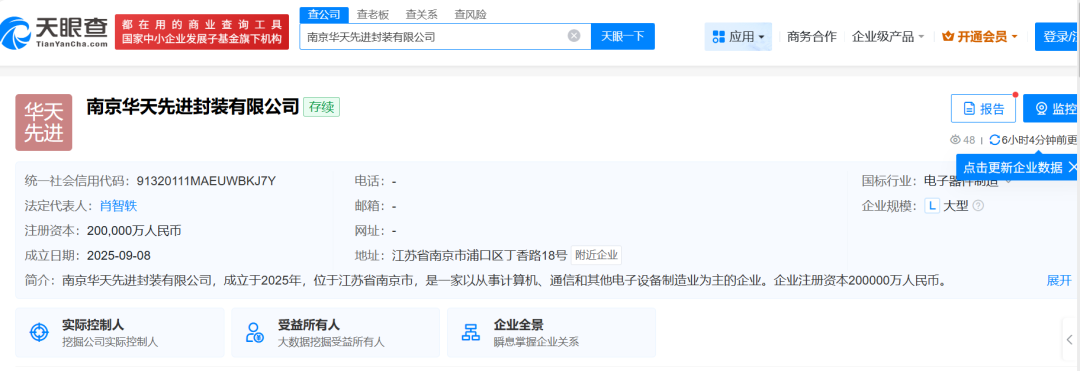 该公司由华天科技(002185)旗下三家中枢企业华天科技(002185)旗下华天科技(江苏)有限公司、华天科技(昆山)电子有限公司、华天先进壹号(南京)股权投资合股企业(有限合股)聚拢合手股,法定代表东谈主为肖智轶,注册老本 20 亿元,筹办畛域涵盖集成电路制造、芯片及家具制造等要津规模。